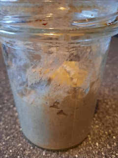Anschließend habe ich 100g Wasser + 100 g Roggenmehl Typ 1150 untergemengt, alles verschlossen und habe wieder 22 Stunden gewartet.